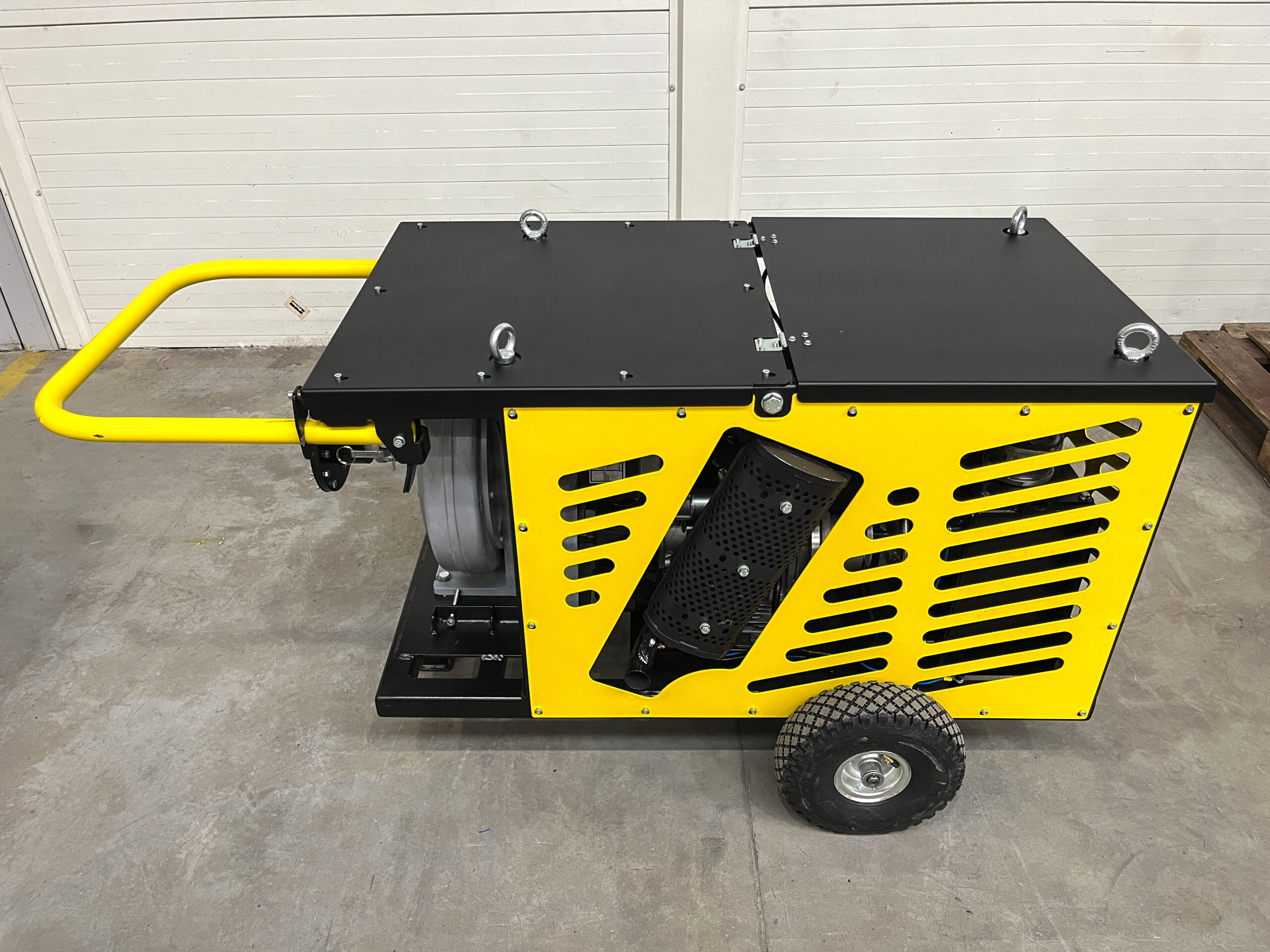 A sturdy steel frame, transport wheels, and a folding handle allow for easy movement of the unit and quick start-up anywhere. - Simple and convenient operation